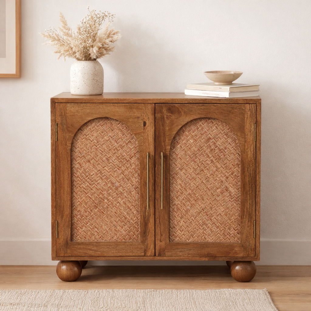 Woven rattan furniture integrates traditional craftsmanship with modern design. This type of furniture includes items such as accent chairs, stools, and dining sets. Indian artisans, known for their intricate weaving techniques, contribute to the artisanal elegance of these pieces. Synthetic rattan options enhance durability and aesthetic appeal.