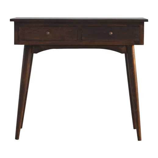 Simple, elegant, country-style charm is what this practical little console table will provide. Suiting most decors, this 100% solid mango wood unit has been built with sustainably sourced timbers and has two drawers to help you keep your home organised and storing any little household objects. This has shiny knobs and has a light walnut finish.
