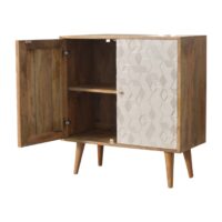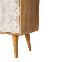 This stunning piece has been constructed from 100% solid mango wood in an oak-ish finish and features nordic style legs. It provides useful storage space and is finished with shiny knobs. The white hand-carved cube design is partnered nicely with the finish of the wood giving an overall modern and chic look.