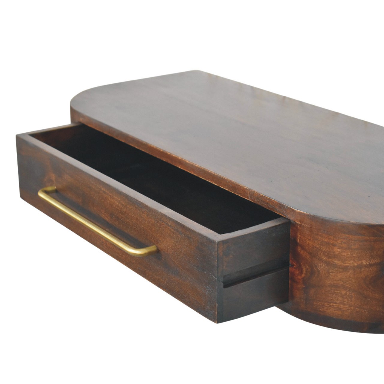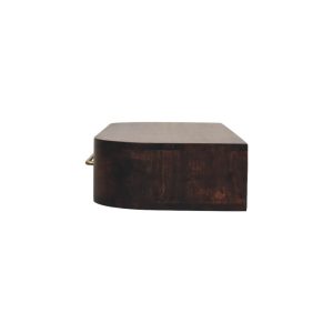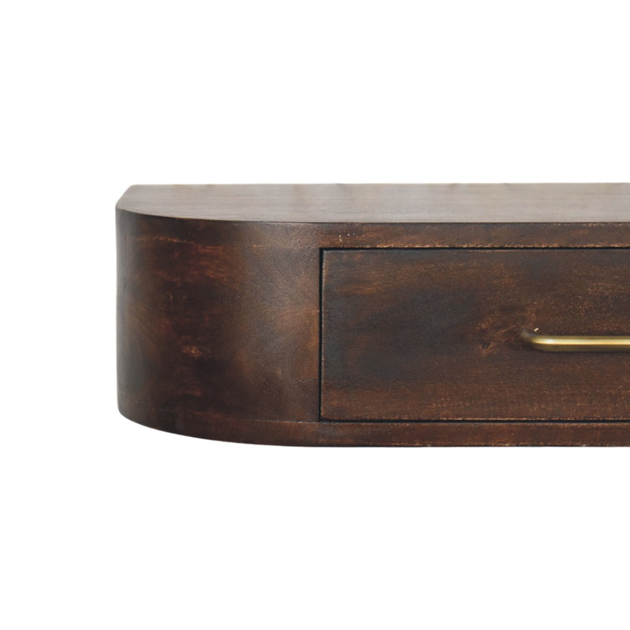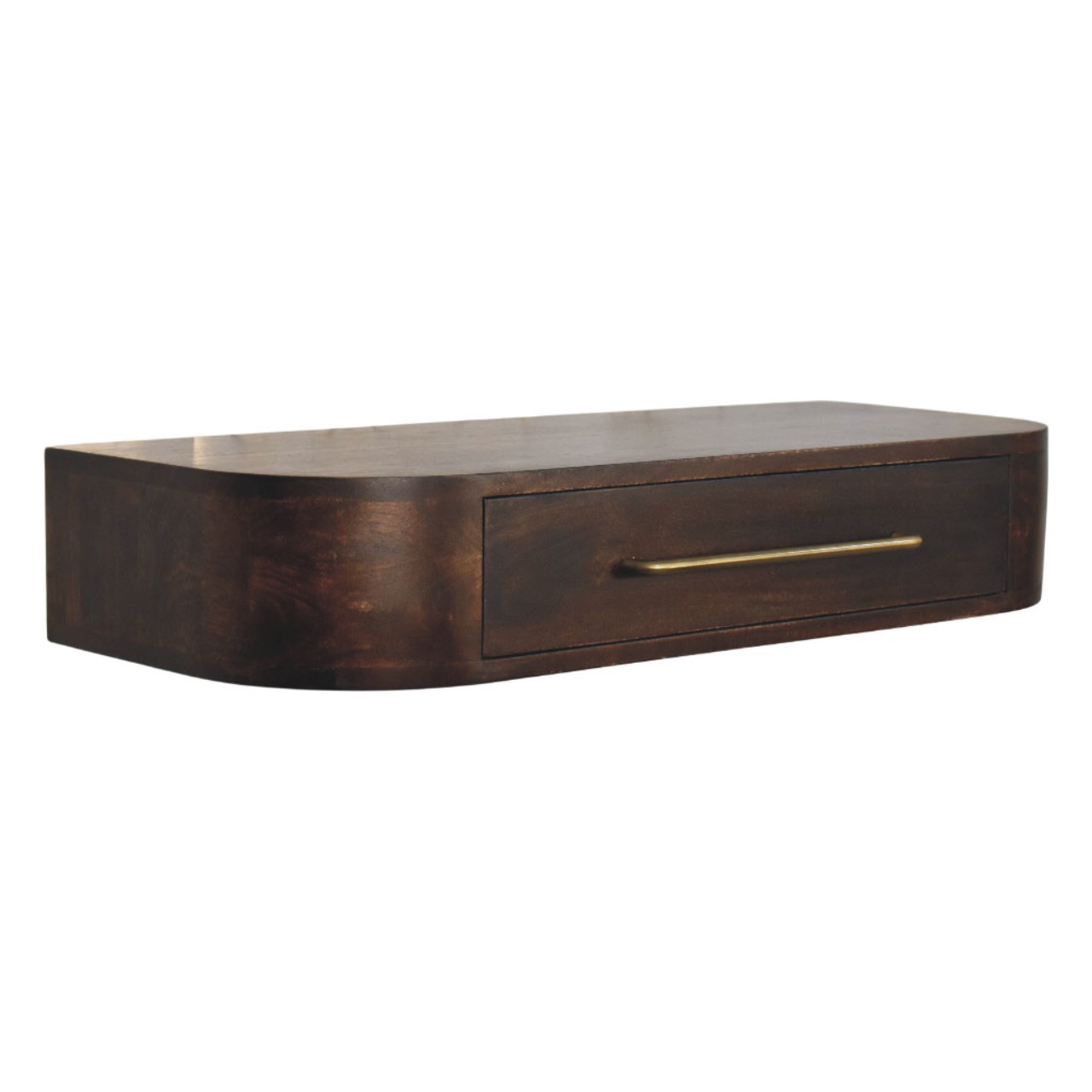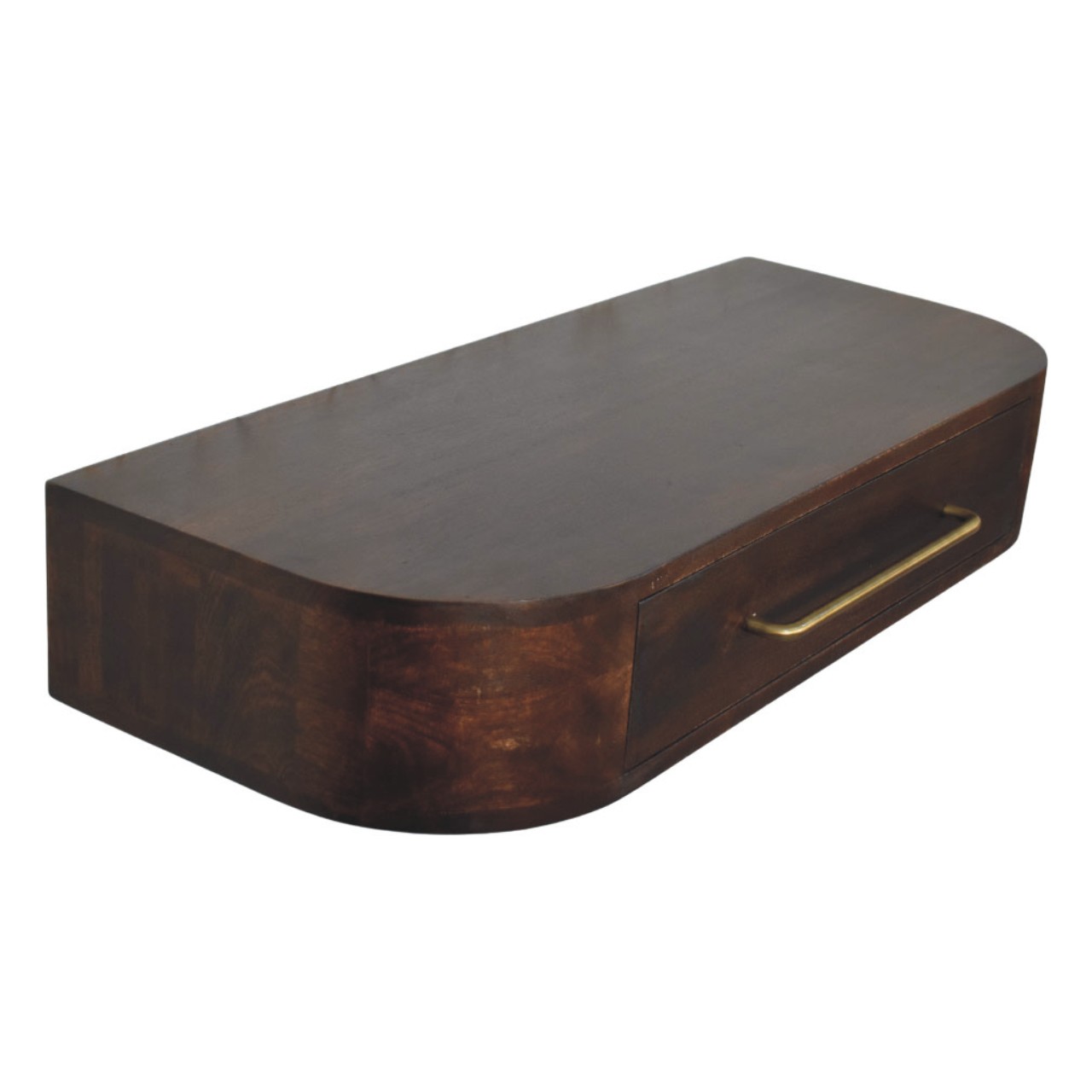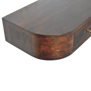 Introducing the Arc Wall Mounted Console, a refined floating piece that blends sculptural elegance with everyday practicality. Handcrafted from 100% solid mango wood, this console features a softly curved silhouette that adds visual softness while maintaining a clean, contemporary profile. The single drawer provides discreet storage for daily essentials, accented with a slim brass handle that brings a subtle touch of contrast and sophistication. Finished in a rich Velvet Mocha tone, the natural grain of the wood adds depth and warmth, making this piece ideal for hallways, bedrooms, or compact living spaces. Designed to sit effortlessly on the wall, the Arc Wall Mounted Console delivers understated luxury with a distinctly artisanal character.