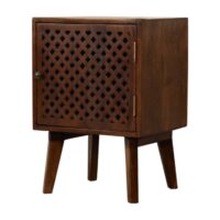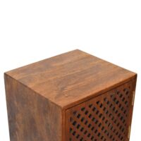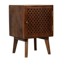 This stunning Arlo Bedside has been constructed from 100% solid mango wood and has a smooth chestnut finish. The main feature of this piece is the carved cutout door front which gives this piece its individual retro character, not forgetting a shelf inside for storage. It also features a shiny brass knob and stands on 4 nordic style legs.