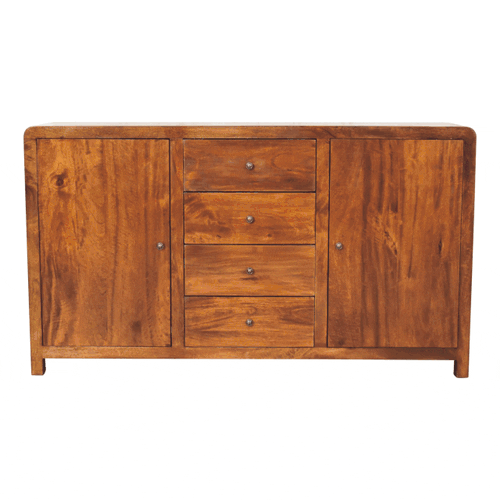 Discover the Aspen Sideboard: a striking addition crafted from 100% solid mango wood in a rich chestnut finish. This piece embodies elegance with its smooth corners for enhanced safety and a modern silhouette that seamlessly integrates into diverse interior designs. With generous storage space, the Aspen Sideboard is an indispensable fixture for any dining or living space, ideal for tidying essentials and displaying decorative items. A lasting investment for your home.