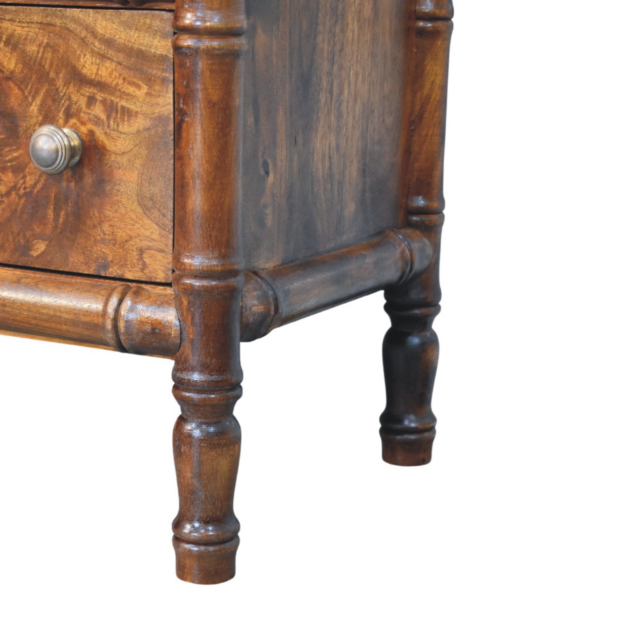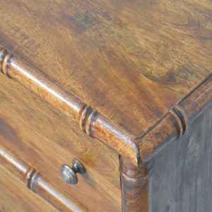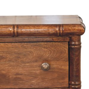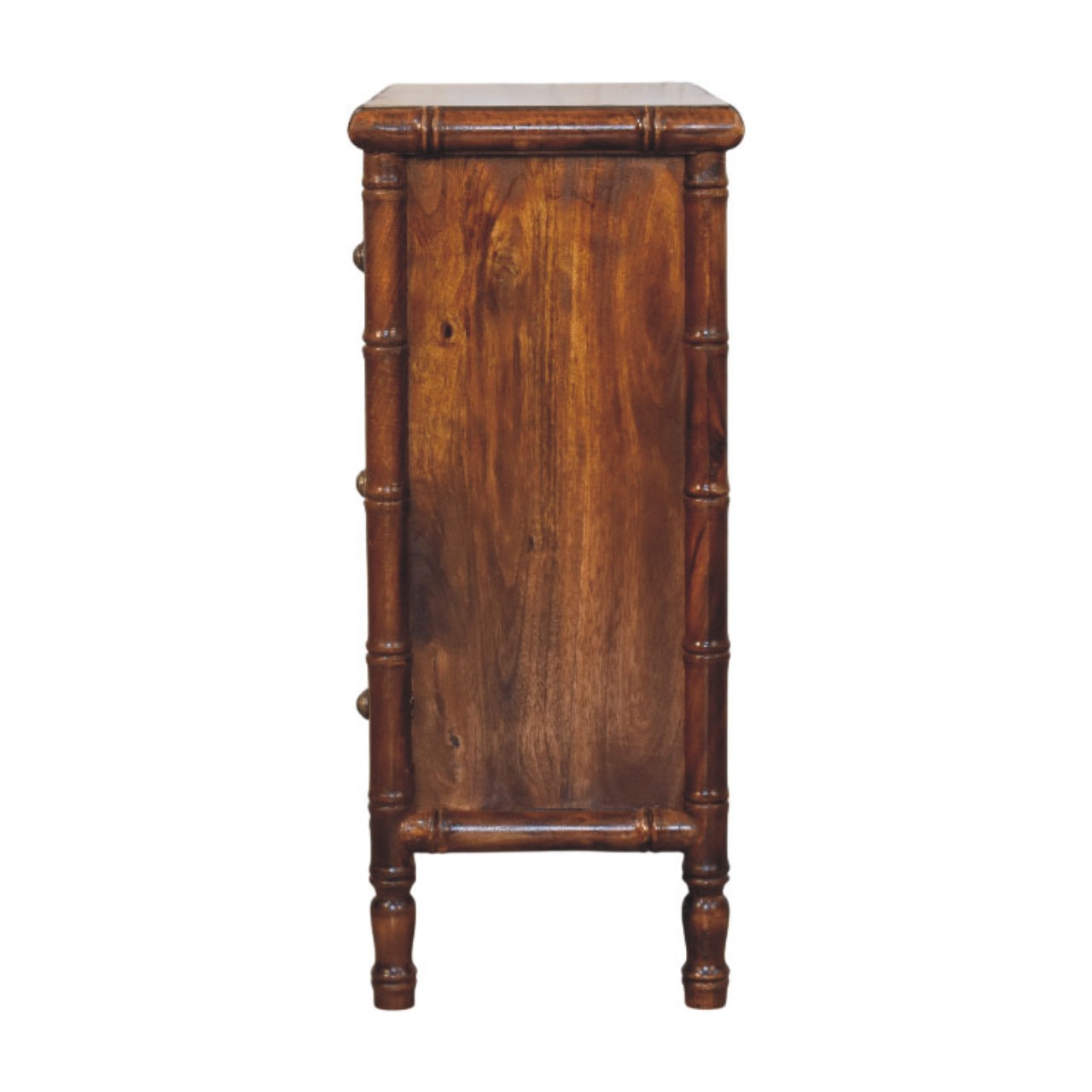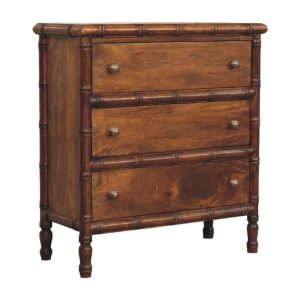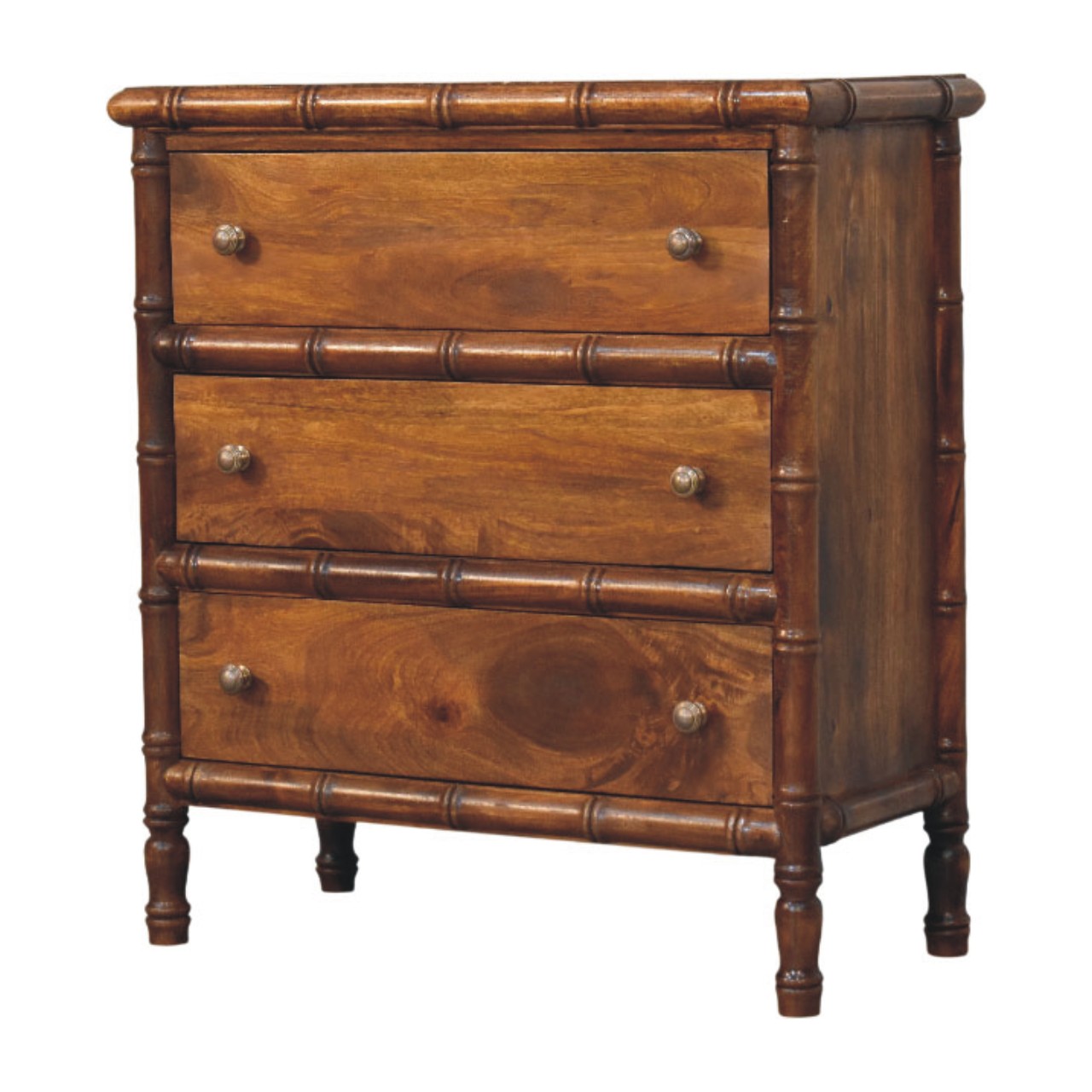 Crafted with a nod to classic bamboo-inspired detailing, this 3 drawer chest brings warmth and character into any bedroom or living space. Handcrafted from 100% solid mango wood, the design features softly turned bamboo-style framing that adds texture and depth without feeling ornate. Finished in a rich Chestnut tone, the natural grain patterns are beautifully enhanced, giving each piece its own unique presence. Three well-proportioned drawers offer practical storage while maintaining a balanced, timeless silhouette. Part of the Bamboo Collection, this chest blends traditional craftsmanship with everyday functionality, making it an enduring addition to both classic and transitional interiors.