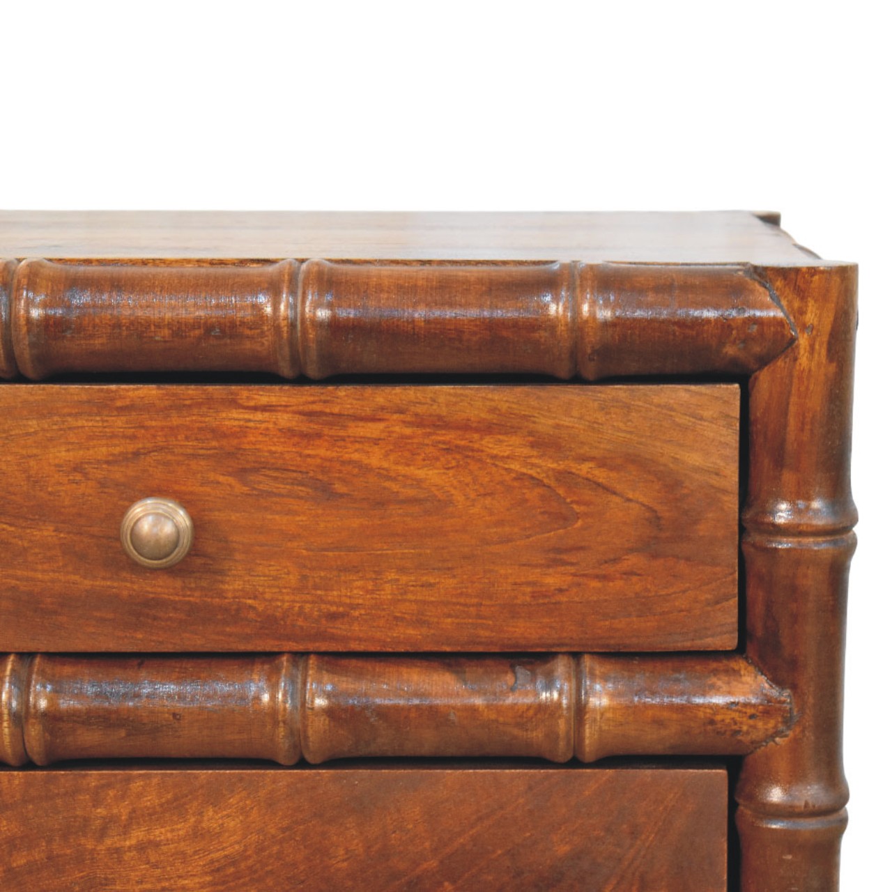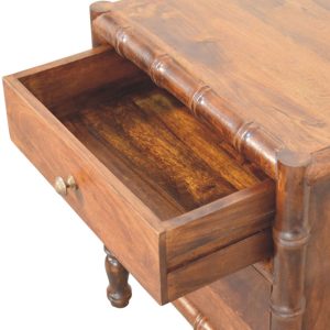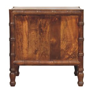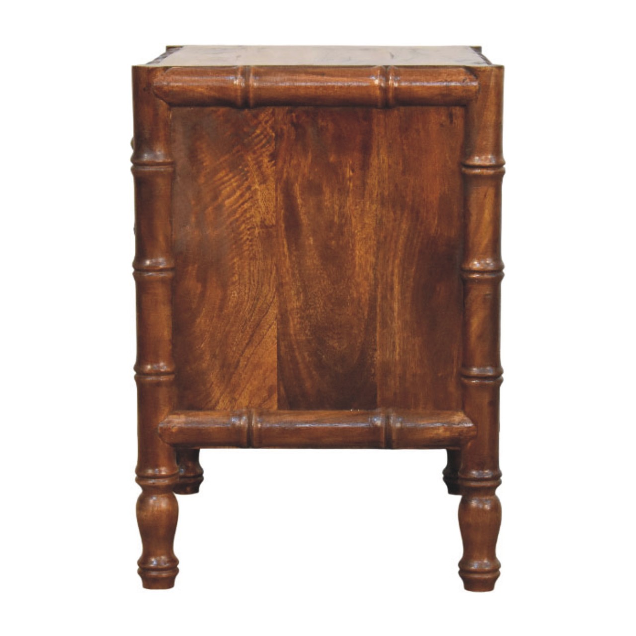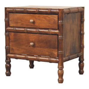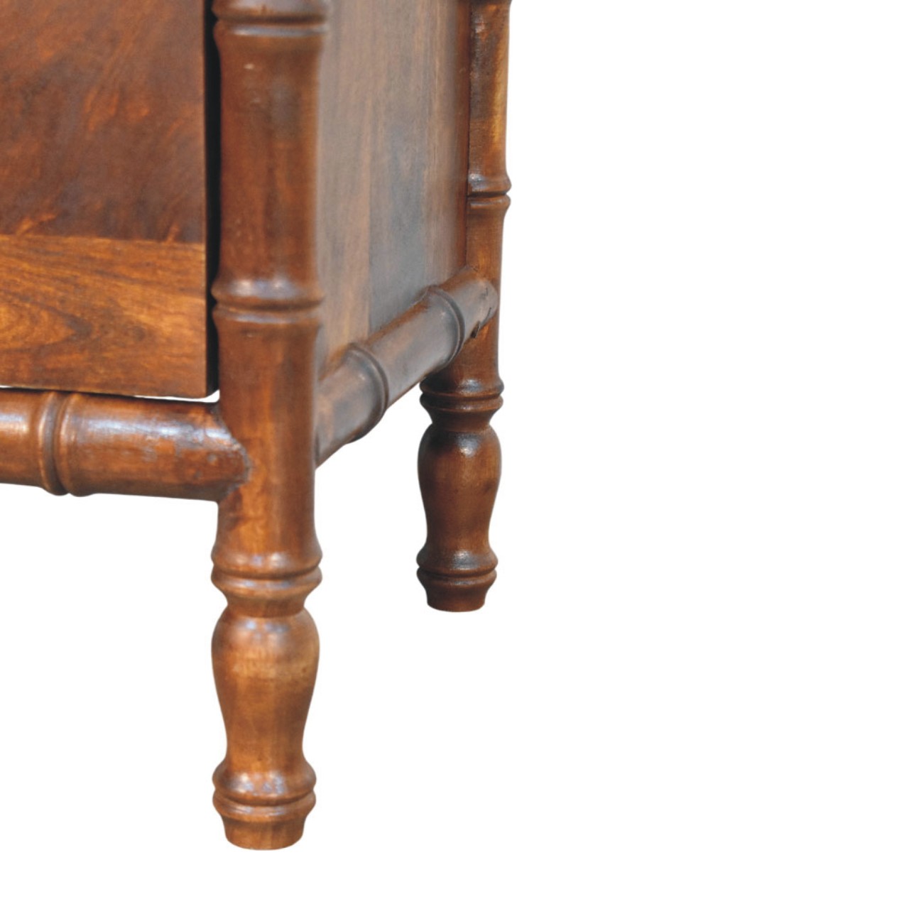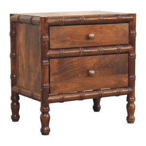 The Bamboo Framed Bedside Table is a timeless bedside piece crafted from 100% solid mango wood, defined by its distinctive bamboo-inspired turned framework that adds depth and character to the design. Finished in a rich Chestnut tone, the warm wood grain enhances its classic appeal while highlighting the natural variations of the timber. Two compact drawers offer practical storage for nighttime essentials, fitted with subtle round knobs that complement the traditional detailing. Balanced on gently turned legs, this bedside table from the Bamboo Collection blends heritage craftsmanship with everyday functionality, making it a refined addition to traditional and transitional interiors alike.