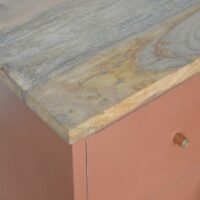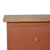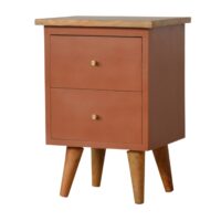 This bedside table has been constructed from 100% solid mango wood and finished with a oak-ish finish top and legs. The body of the bedside has been finished in a hand-painted brick red paint and features shiny knobs on the 2 drawers for easy access. This bedside is bound to spice up your bedroom.