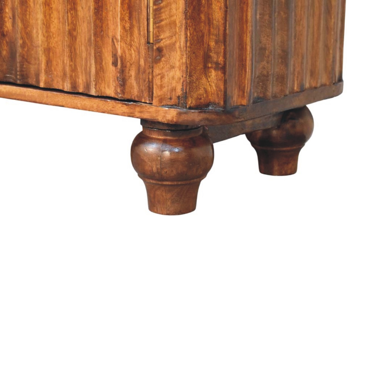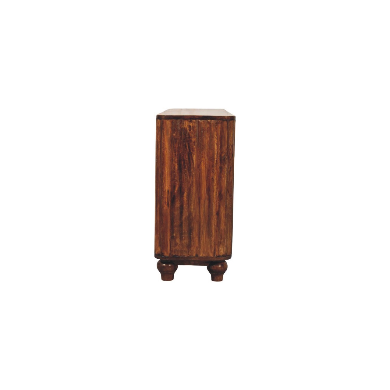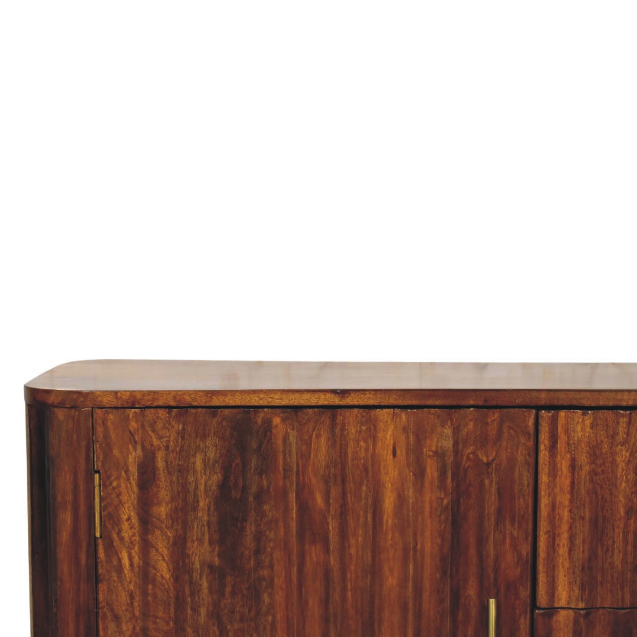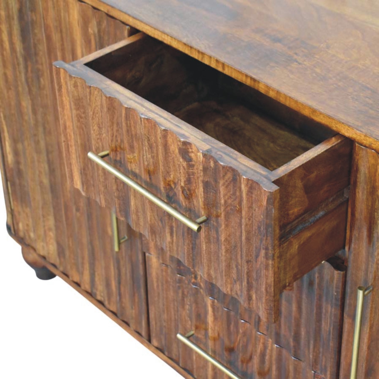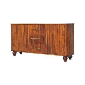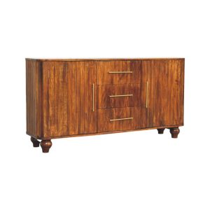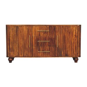 Crafted from 100% solid mango wood and finished in a deep Chestnut hue, this elegant sideboard showcases the beauty of natural grain in a softly curved silhouette. The rounded edges lend a refined, contemporary feel, while three centrally positioned drawers and two spacious cabinets provide versatile storage for dining essentials, linens, or everyday living items. Slim brass handles add a subtle metallic contrast against the warmth of the timber, enhancing its understated sophistication. Resting on gently turned feet, this piece balances strength with elegance, making it a timeless addition to both modern and classic interiors.