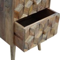 The main feature of this bedside are the carved cube drawer fronts which make the pieces from this collection stand out. It has been constructed from 100% solid mango wood in an oak-ish finish and stands on 4 Nordic-style legs. It can be partnered with the other pieces from the range or stand individually as its style is versatile and can fit into different types of interiors.