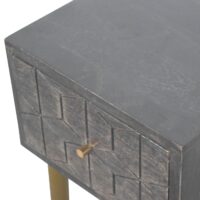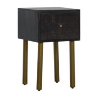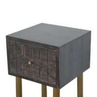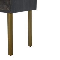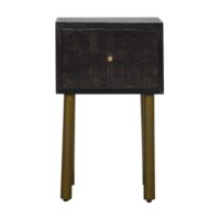 This luxurious bedside has been constructed from 100% solid mango wood in a washed black finish and carved design. It has a neat design on the drawer front and a carefully placed knob in the middle which matches up perfectly with the straight brass legs.