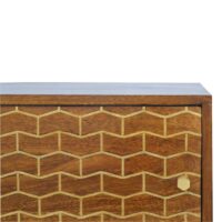 This solid timber sideboard is expertly constructed from 100% solid mango wood in a chestnut finish and features a clean and simple design to suit most homes. It has a gold pattern on the door front with 2 shiny knobs. This piece will compliment your home beautifully whether it is a standalone piece or partner with the other pieces from the range. It is carefully finished in a durable lacquer to help protect and enhance the look of this solid oak piece of furniture.