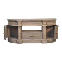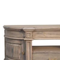 Introducing our beautiful serpentine media unit, expertly crafted from 100% pine wood. The aged/weathered finish adds a vintage charm, while the shiny brass knobs and handle create a unique contrast. With ample storage space, it’s a stylish and practical addition to your living room.