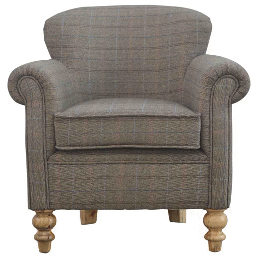 This arms chair is fully upholstered in multi tweed, and constructed from 100% solid mango wood. Other features include sheltering arms and 2 hand turned legs at the front and 2 tapered legs at the back which have a fine oak-ish finish. It is the perfect addition to any living space in your home, and is extremely comfortable to sit on.