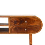 This media unit is an architectual piece of beauty with it having the functionality to be used in many different ways. It gives plenty of storage space for whatever you see necessary while its robust and sturdy design means it will last for a long time. It is made with 100% solid mango wood with an chestnut finish.