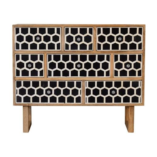 This chest is alive with personality allowing you to create a cozy environment. It is made from 100% solid mango wood in a oak-ish finish and will meet all your expectations of a chest. Its lovely pattern will give your home a modern vibe as well as providing 3 spacious drawers for convenience. It has been constructed from 100% solid mango wood in an oak-ish finish and tje bone inlay is sourced responsibly from deceased animals such as camels, goats, and buffaloes.