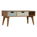 This solid timber media unit is expertly constructed from 100% solid mango wood, and has a clean and simple design to suit most homes. It comes with 2 cut out drawers that are hand spray painted in 2 different tones of green and white, also there is one shelf to place a cable box, pictures etc. Other features include 4 Scandinavian styled feet and a decent sized table top to place any large devices.