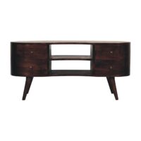 This solid wood media unit has been constructed from 100% solid mango wood in a light walnut finish and offers a unique shaped design with rounded edges. It features four drawers that have shiny knobs and Nordic-style legs. A nice addition to the living room.