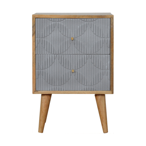 Add this lovely bedside to your bedroom. It features a beautiful hand carved design on the door front and has been constructed from 100% solid mango wood in an oak-ish finish with grey hand painted drawer fronts. It offers 2 drawers that provide plenty of storage and are useful before bedtime.