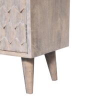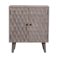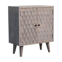 This mini cabinet has been constructed from 100% solid mango wood and has a fine stone finish. Its pineapple-carved design gives the product a unique twist and provides enough space with 2 doors that offer useful storage. Other features include shiny knobs and 4 Nordic style feet. This cabinet is the perfect addition to any home.