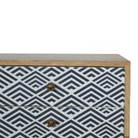 This beautiful and unique media unit has been constructed from 100% solid mango wood in a fine oak-ish finish with a curved bottom design. The main feature of this piece are the monochrome screen printed drawer fronts which provide a lovely contrast between the print and the wood. Some other features include 4 Nordic style legs and 2 open slots with 2 drawers for extra storage.