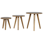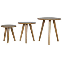 This set of 3 Nordic style round stools are made of 100% mango wood and are perfect for providing extra seating for guests or everyday use. The stools also work as side tables, providing excellent versatility. With their compact size, they are perfect for use in small spaces and can be tucked away under one another partially. Other features include Nordic style legs and a fine oak-ish finish. These 3 tables are of Partial nesting. Small: 30cm X 30cm X 31cmMedium: 35cm X 35cm X 37cmLarge: 45cm X 45cm X 42cm
