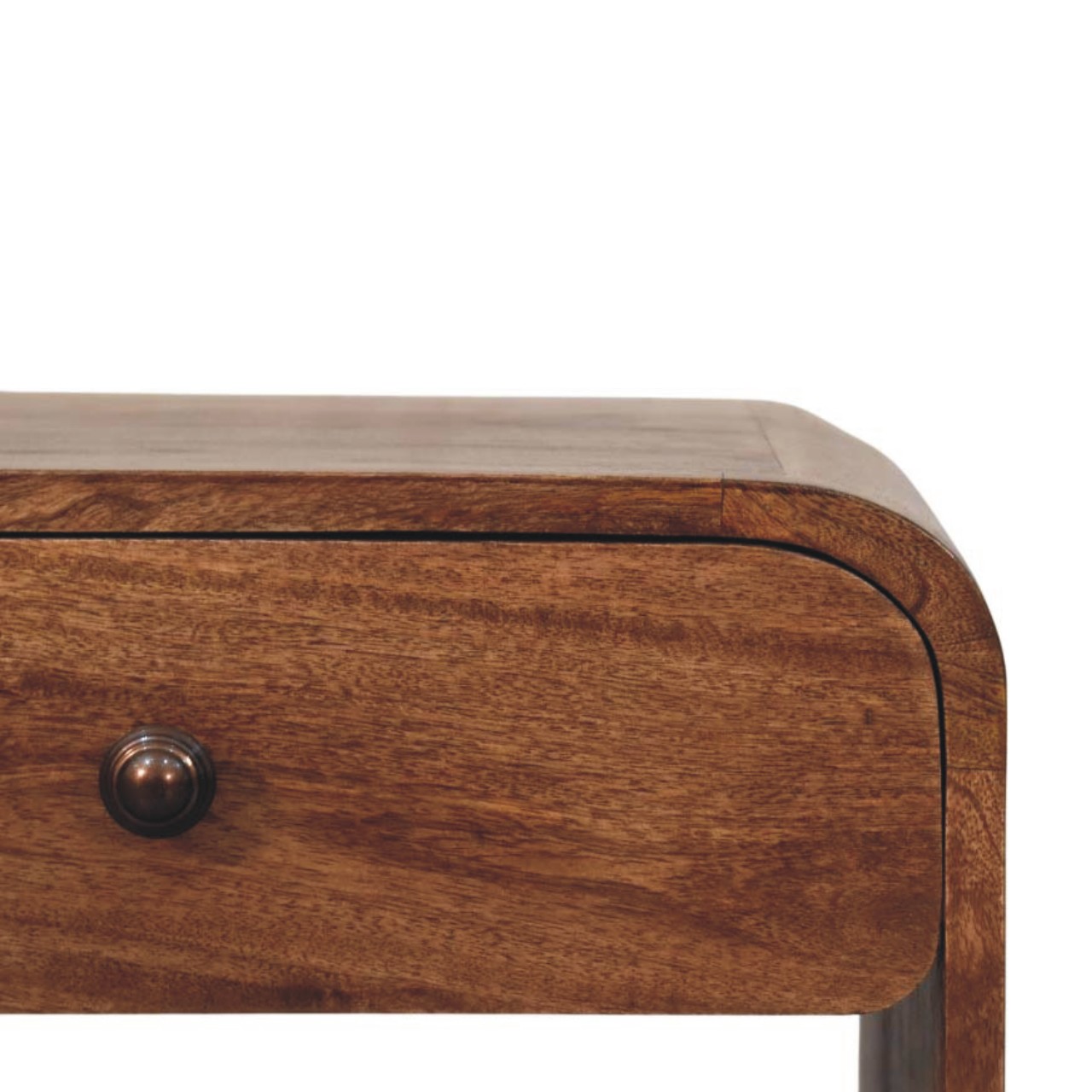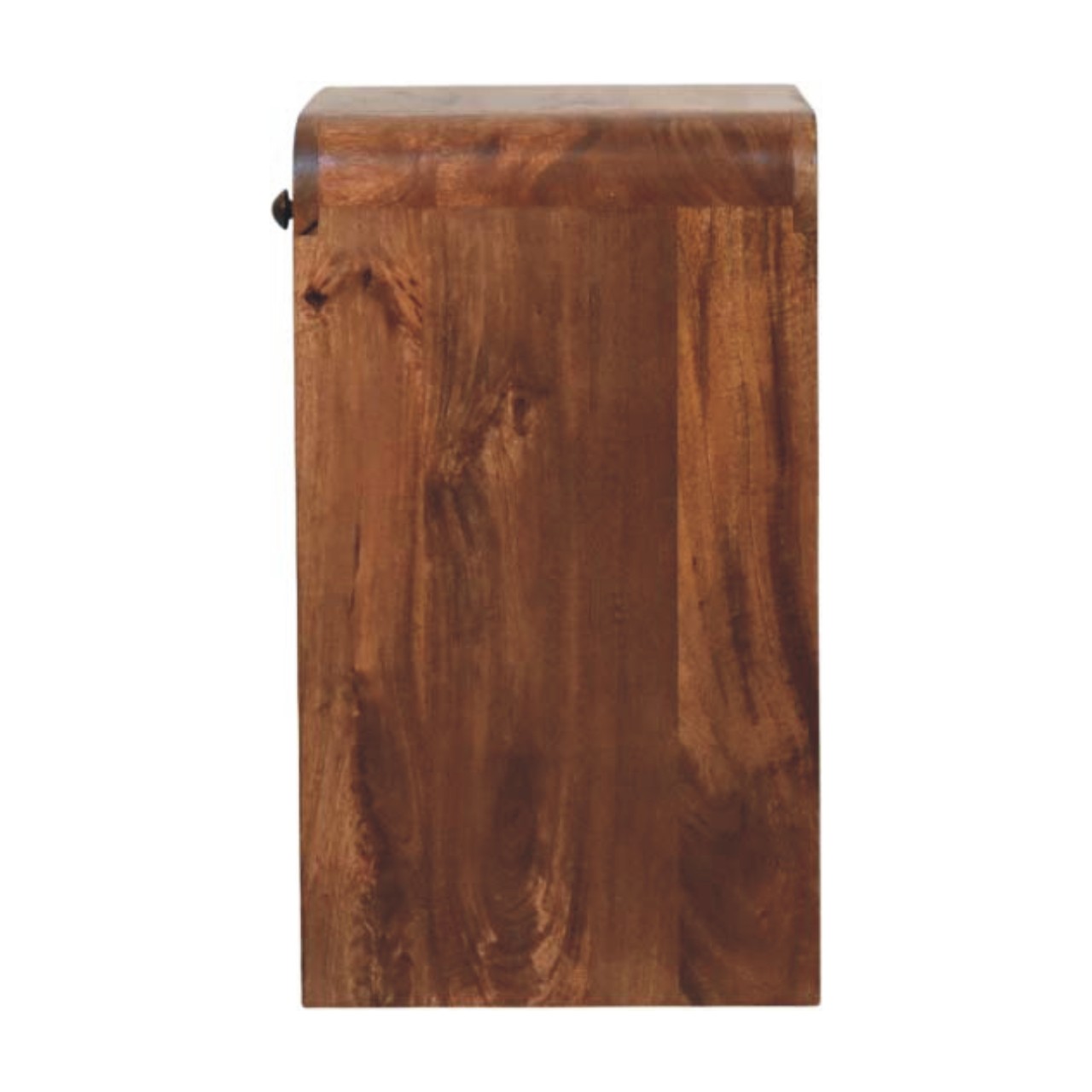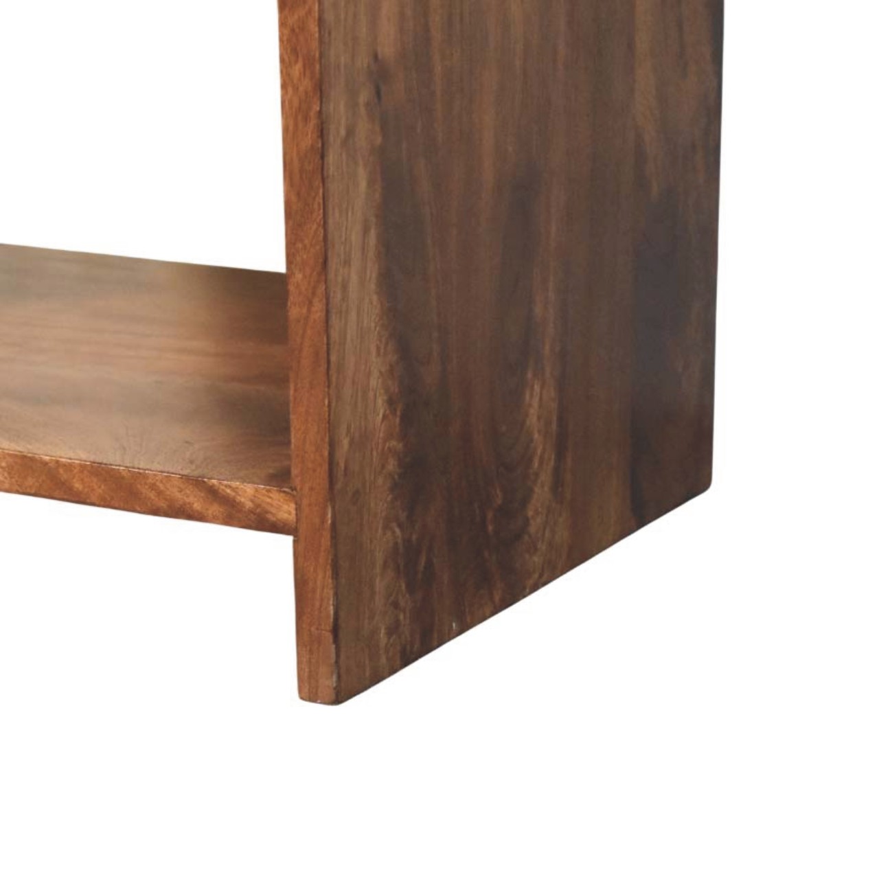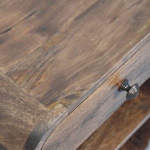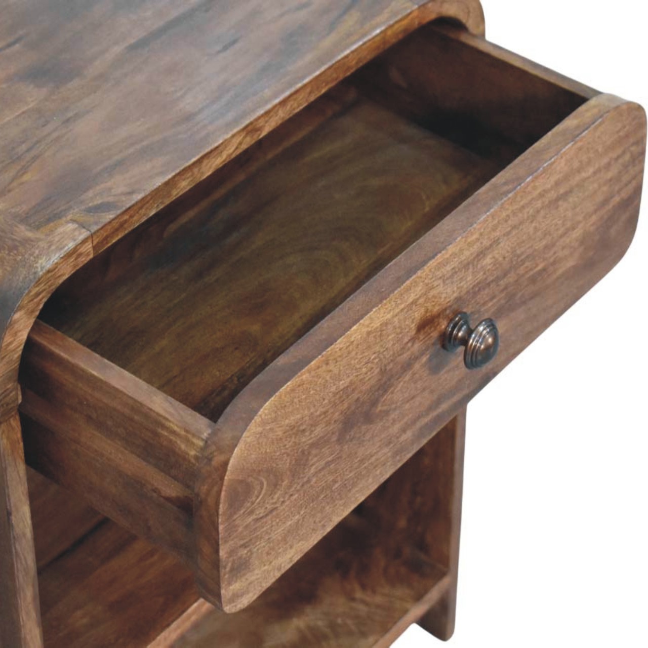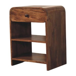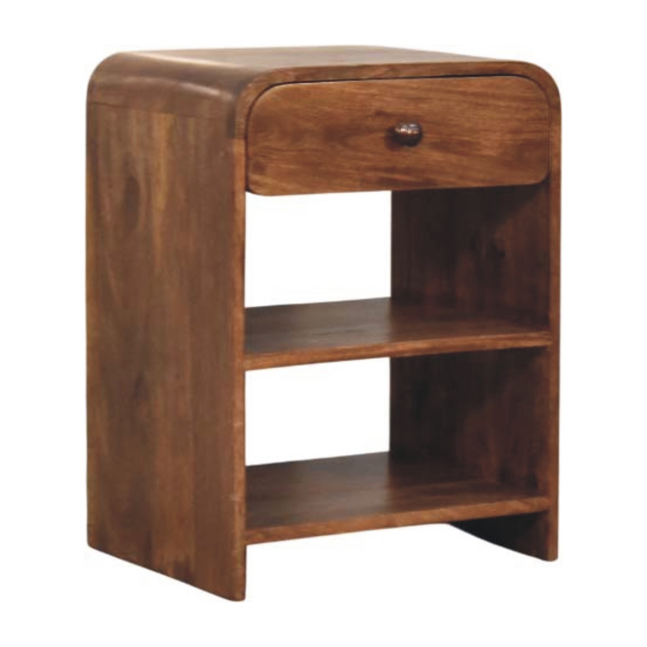 Practical in design and refined in appearance, this bedside is handcrafted from 100% solid mango wood and finished in a rich Roasted Almond tone that enhances the natural grain. The softly curved top drawer, fitted with a classic knob, offers convenient storage for essentials, while the two open shelves below provide ample space for books, décor, or everyday items. Its clean, open structure keeps the look light and functional, making it ideal for both compact and spacious interiors. Thoughtfully balanced between storage and style, this piece brings warmth and versatility to any bedroom setting.