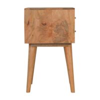 Part of our Rafina range this bedside has been constructed from 100% solid mango wood in an oak-ish finish. It has 2 Black Resin Inlay drawers for storage convenience, Nordic style legs and the shiny knobs gives a lovely contrast against the print. More items are available from the Rafina range.