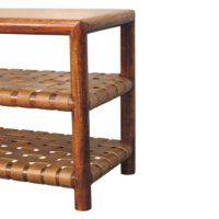 Introducing the Braided Shoe Rack, where timeless design meets everyday functionality. Crafted from 100% solid mango wood in a rich Chestnut finish, this piece features three open shelves with two slots made with intricately braided leather, adding a unique texture and rustic elegance. Perfect for organizing shoes, accessories, or household essentials, its sturdy frame ensures lasting durability. The clean lines and warm tones make the Braided Shoe Rack a versatile and stylish storage solution that enhances the charm of any entryway, hallway, or living space.