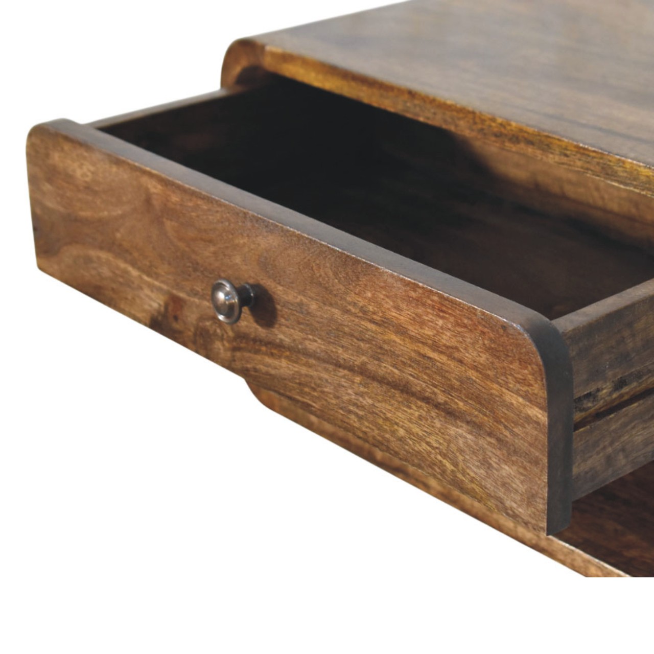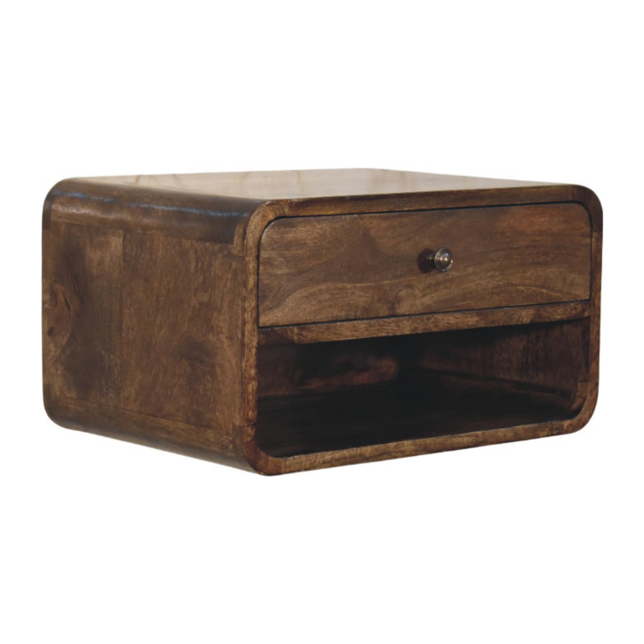 Handcrafted from 100% solid mango wood in a Classic Grey finish, this elegant bedside table features soft, rounded edges and a contemporary silhouette. It includes a single drawer with a smooth knob handle for discreet storage and an open shelf below for books, baskets, or décor. Compact yet functional, this piece adds a warm, modern touch to bedrooms or living areas, celebrating the natural grain and artisanal charm of solid wood craftsmanship.