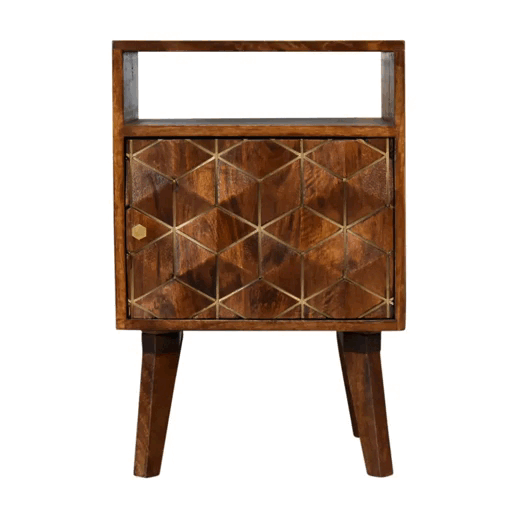 Want to add a Scandi vibe to your home? Our Samara Bedside provides storage with a cupboard and open slot and is ideal for modern and contemporary bedrooms, designed for you to keep all of your belongings close by. This gorgeous piece has been constructed from 100% solid mango wood in a chestnut finish and features a carved diamond brass inlay pattern on the door along with a shiny brass knob.