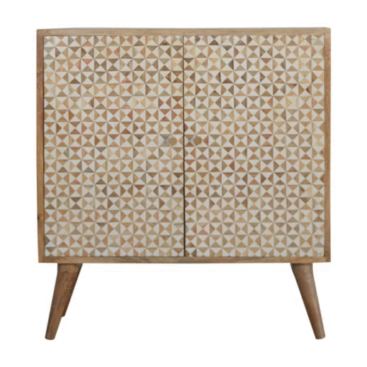 This cabinet has been constructed from 100% solid mango and features a unique design made from a wooden inlay of little white resin pieces to create a dimensional look. It has Nordic-style legs and round shiny knobs.