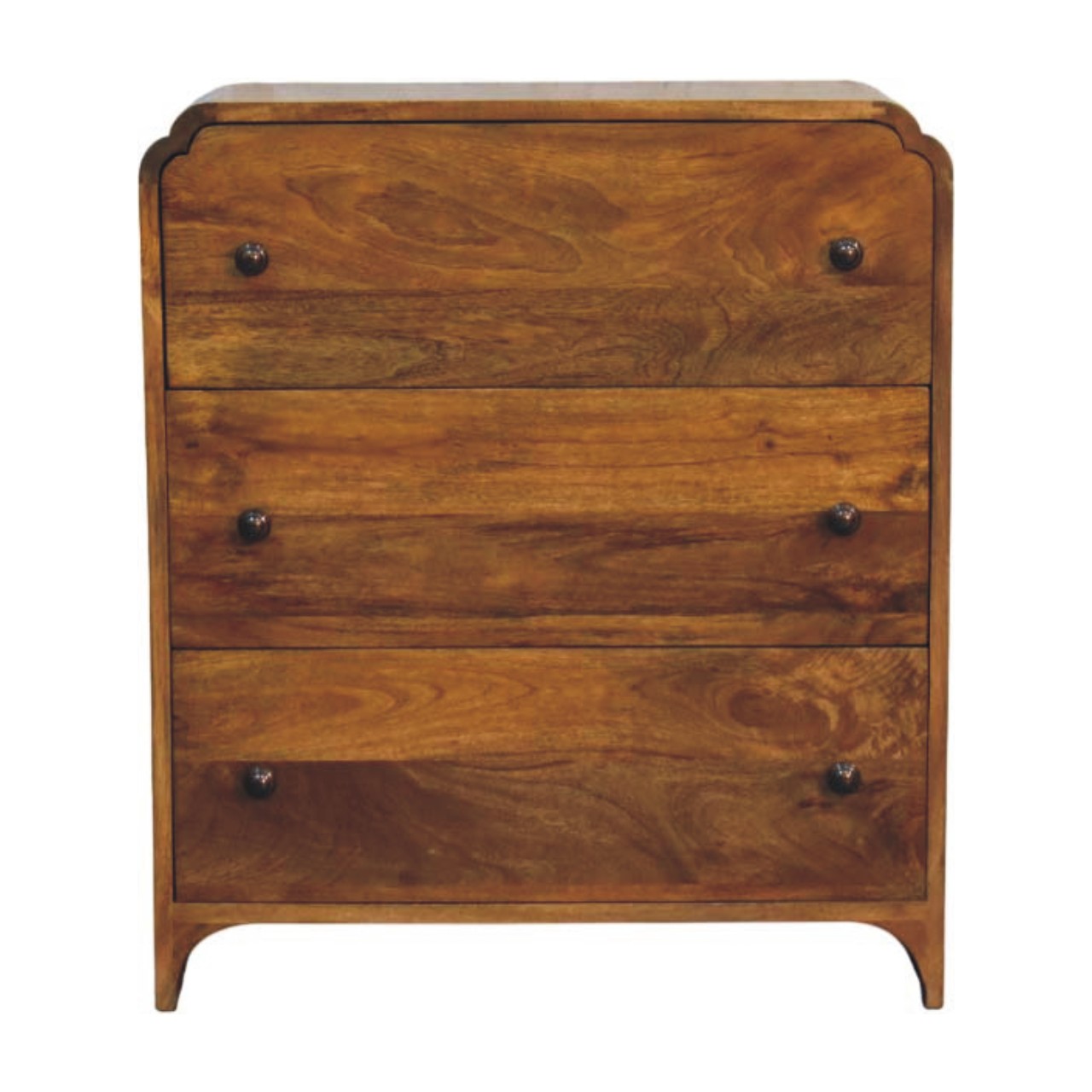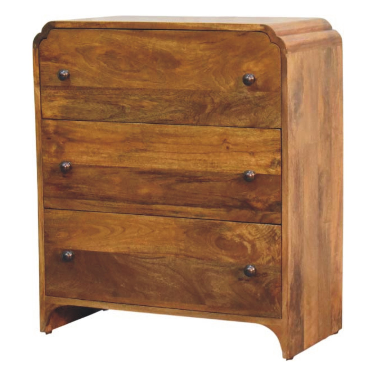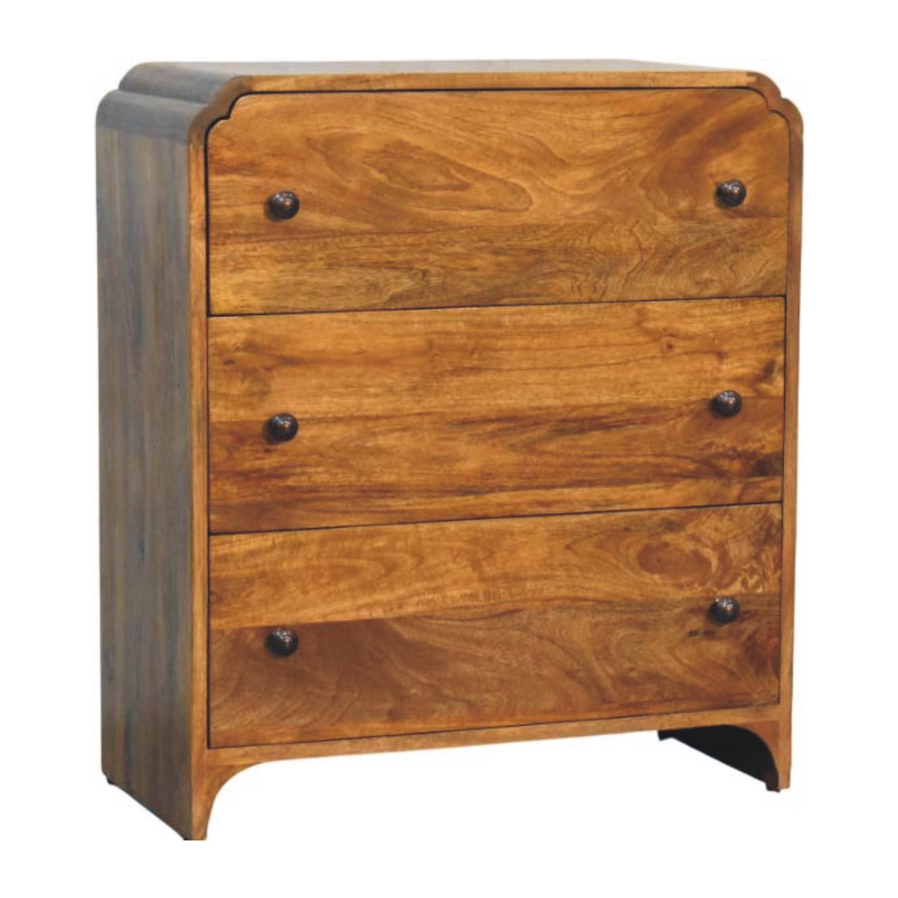 Elegantly detailed with a softly scalloped silhouette, this chest is handcrafted from 100% solid mango wood and finished in a warm Amber Oak tone that enhances the natural grain. The three drawers offer practical storage for everyday essentials, each fitted with classic round knobs that complement the timeless design. Its gently curved edges and balanced proportions bring a subtle sense of refinement, while the elevated legs add lightness to the overall form. Combining traditional craftsmanship with a clean, versatile aesthetic, this piece is a graceful addition to both modern and classic interiors.