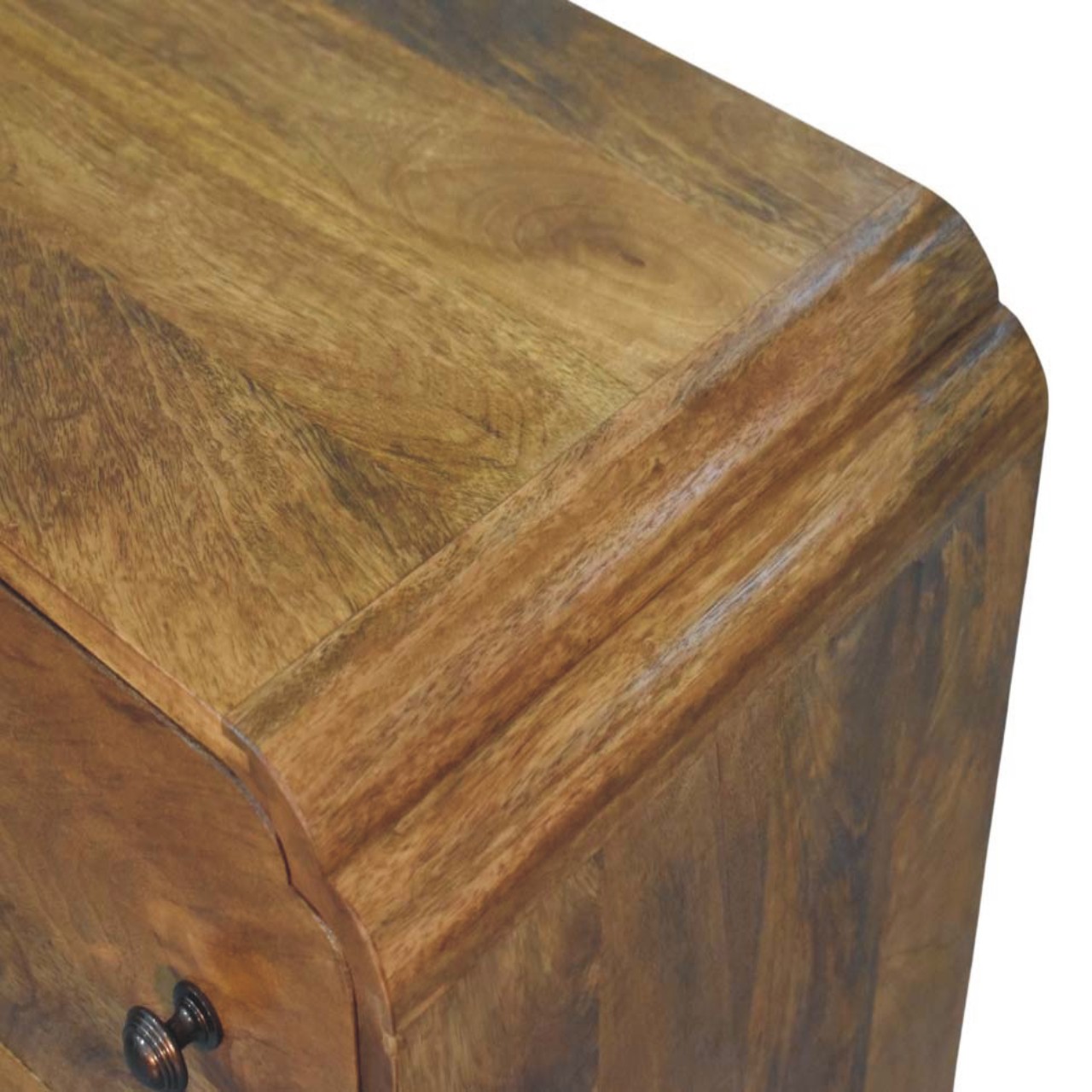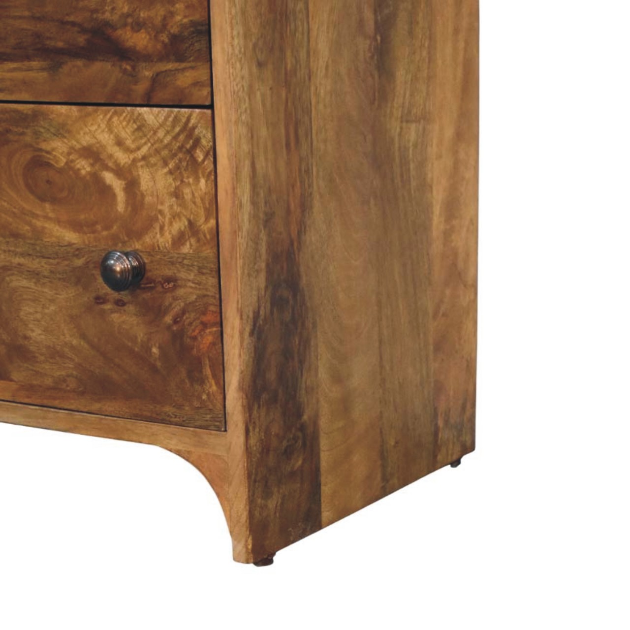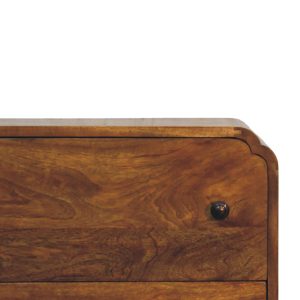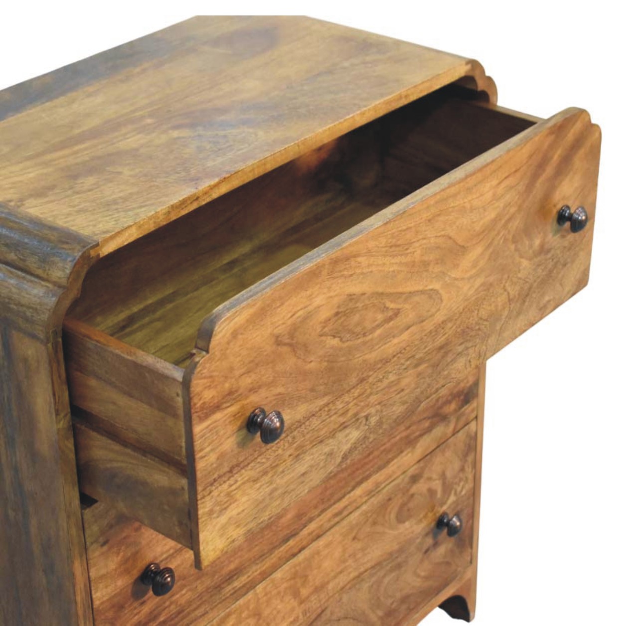 Elegantly detailed with a softly scalloped silhouette, this chest is handcrafted from 100% solid mango wood and finished in a warm Amber Oak tone that enhances the natural grain. The three drawers offer practical storage for everyday essentials, each fitted with classic round knobs that complement the timeless design. Its gently curved edges and balanced proportions bring a subtle sense of refinement, while the elevated legs add lightness to the overall form. Combining traditional craftsmanship with a clean, versatile aesthetic, this piece is a graceful addition to both modern and classic interiors.