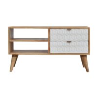 This 2 drawer, 2 open slot media unit has been constructed from 100% solid mango wood and finished in a fine oak-ish finish body. The main feature of this piece is the white Hand-painted carved fronts giving the piece extra dimension and character. Useful storage is provided with open slots and drawers that can be used to store any CDs, films, or books. It also features 4 Nordic style legs and ample space on top for the TV