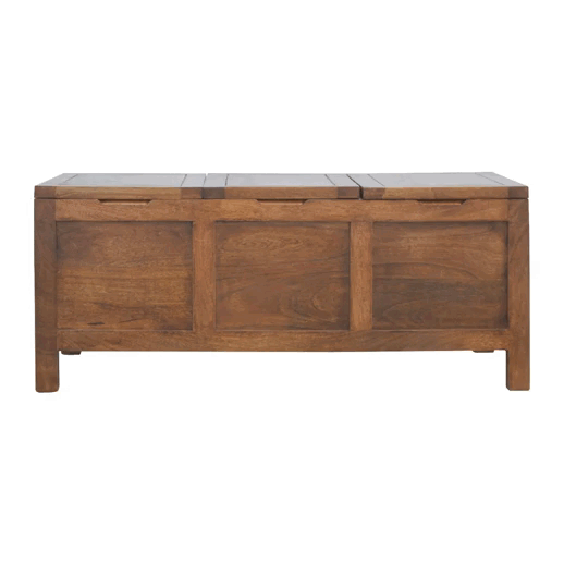 Add this folding tucker table to your dining room, conservatory or hallway. It features an open compartment in the middle which is handy for placing any bottles of wine and 2 lid up storage seats which can be used for late night laughs with friends and family, and perfect for stroring away any blankets or cushions. It has been constructed from 100% solid mango wood in a chestnut finish and 4 straight.