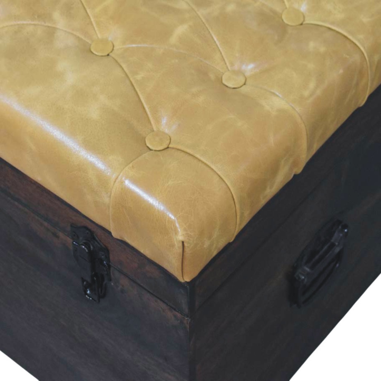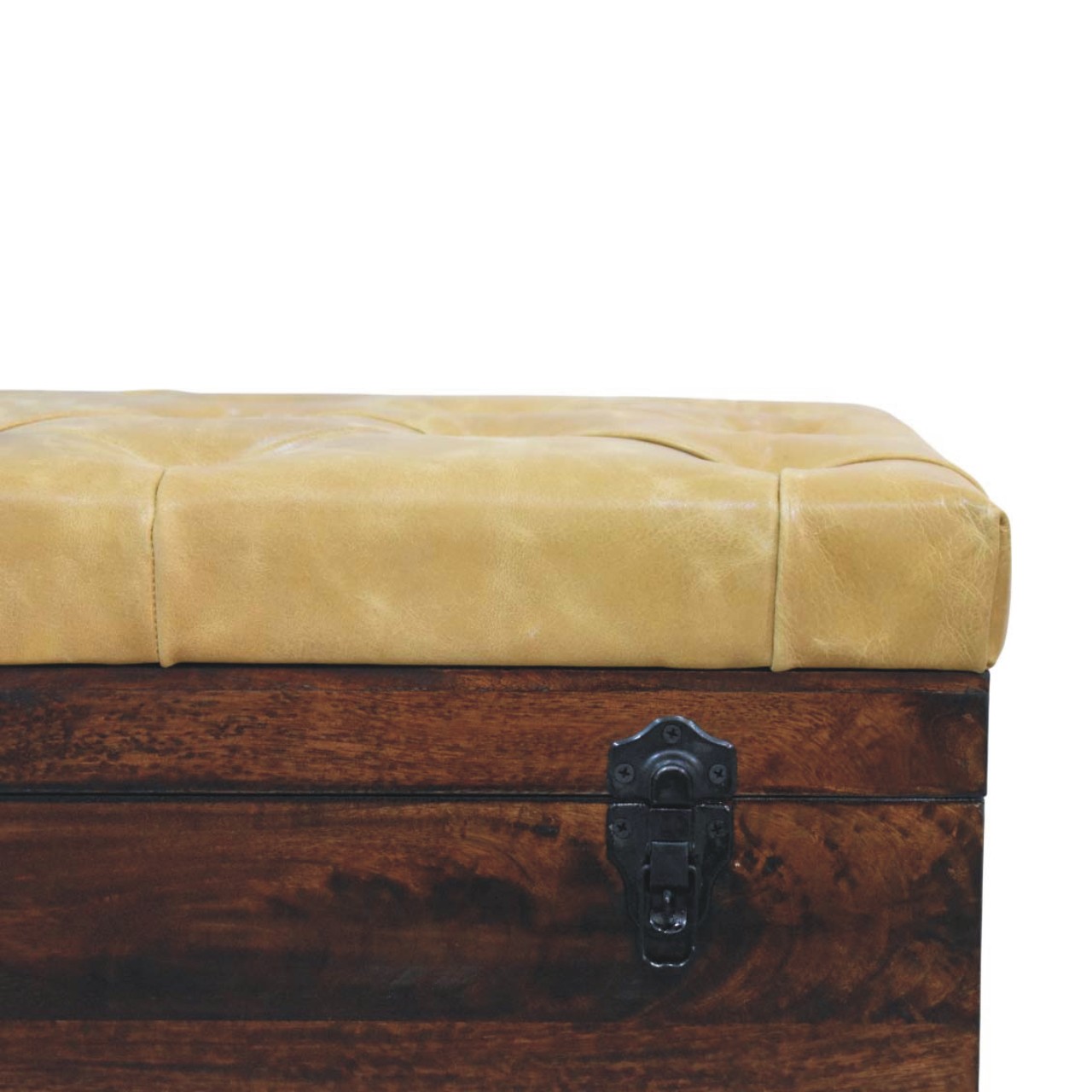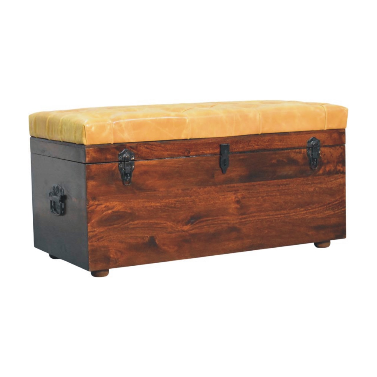Designed to combine comfort with practicality, this storage trunk bench is handcrafted from 100% solid mango wood and finished in a warm natural tone that highlights the rich movement of the grain. The cushioned top is upholstered in smooth Tan leather with deep button tufting, creating a comfortable seating surface while adding a classic, tailored aesthetic. Beneath the seat lies a spacious interior compartment, ideal for storing blankets, cushions, or everyday essentials. Antique-style metal clasps on the front enhance its vintage-inspired character, while the sturdy wooden structure ensures durability. Perfect for bedrooms, hallways, or living spaces, this versatile piece offers both elegant seating and generous hidden storage.