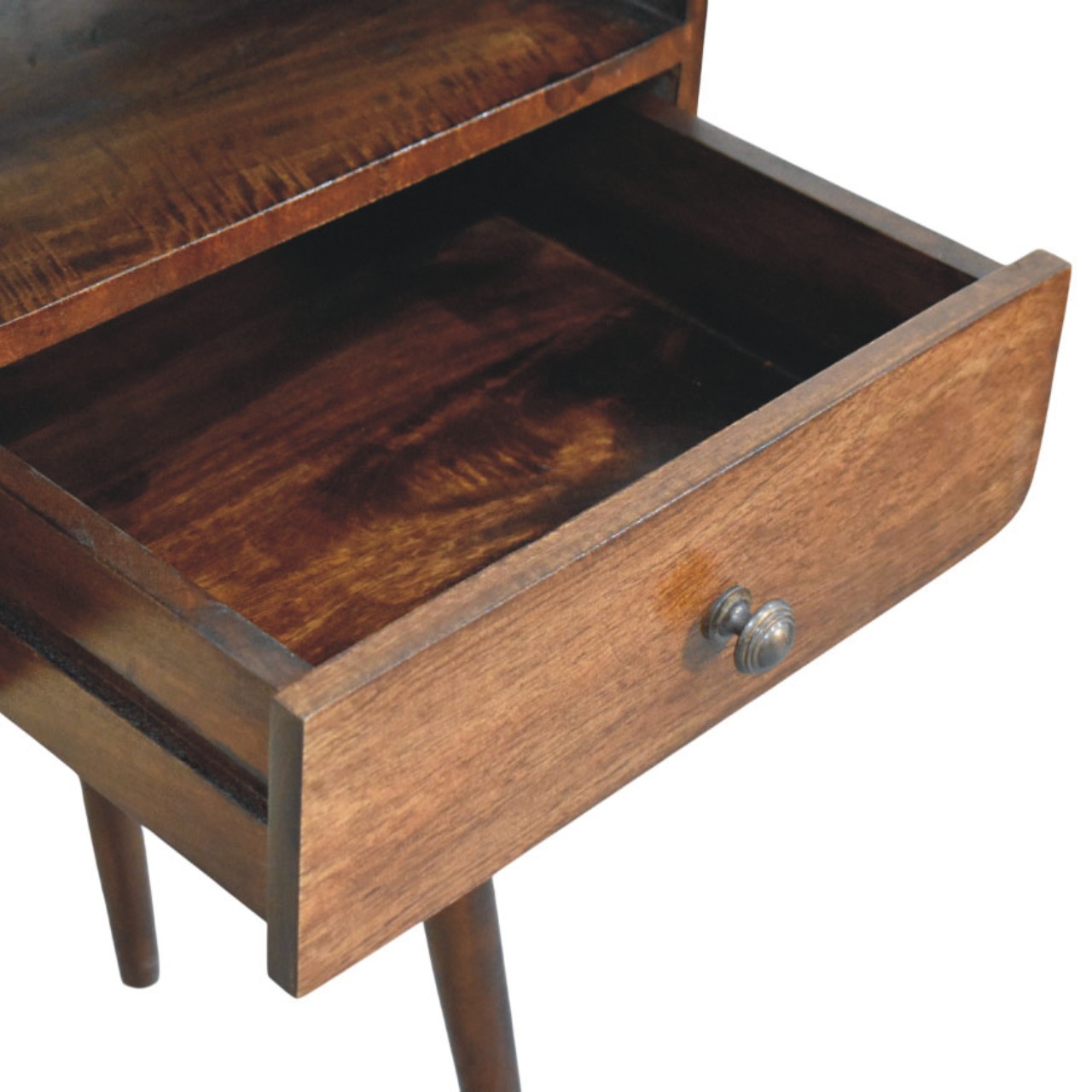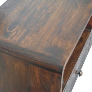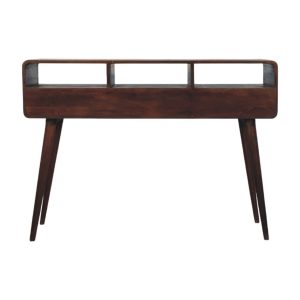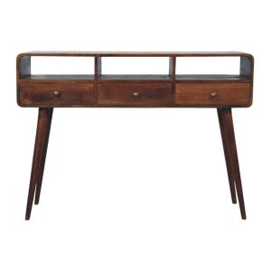 Refined and architectural in presence, this three drawer console table is handcrafted from 100% solid mango wood and finished in a rich California Walnut tone that enhances the depth and movement of the natural grain. The softly rounded edges and slim, tapered legs create a light mid-century silhouette, while three spacious drawers offer practical storage for everyday essentials. An open upper shelf adds further functionality, perfect for displaying books or decorative accents. Designed to sit effortlessly in hallways, living rooms, or home offices, this console balances clean lines with warmth, delivering timeless style with thoughtful craftsmanship.