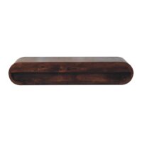 This curved wall-mounted console table is the perfect way to save space and avoid the hassle of legs in the home. Constructed from 100% solid mango wood it has a california walnut finish and great storage options with 2 drawers and ample space on top for ornaments, plants, or books. Use alone or with the rest of the curved chestnut collection.