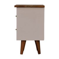 This bedside table has been constructed from 100% solid mango wood and finished with a oak-ish finish top and Nordic legs. The body of the bedside has been finished in a hand painted white paint and features shiny knobs on the 2 drawers for easy access. This bedside is bound to spice up your bedroom.