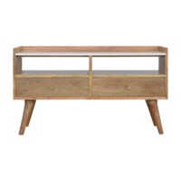 This solid mango wood media unit has been constructed from 100% solid mango wood, some features include nordic style legs, 2 open slots and 2 drawers for storage along with a gallery back and faux marble top. Perfect for use in the living room.