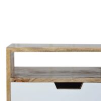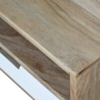 This solid wood Nordic style bedside is a fabulous addition to your home adding a more modern feel your bedroom with its design. It has been constructed from 100% solid mango wood in an oak-ish finish. It comes with 1 cut out drawer that has been hand painted white and 1 open slot. Other features include 4 knock down Nordic style legs.